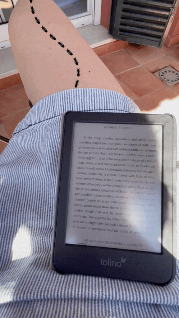 Ich suche mir eine Sonnenliege aus den Plastikbalkonmöbeln aus und mache es mir für meine erste Lektüre bequem. Ich lese Hey, guten Morgen, wie geht es dir? von Martina Heftner, Gewinnerin des Deutschen Buchpreises 2024, das von meiner Kindheitsbibliothek direkt auf meinen E-Reader geliefert wurde, staune darüber, was das 21. Jahrhundert so alles kann und fühle mich #gesegnet.